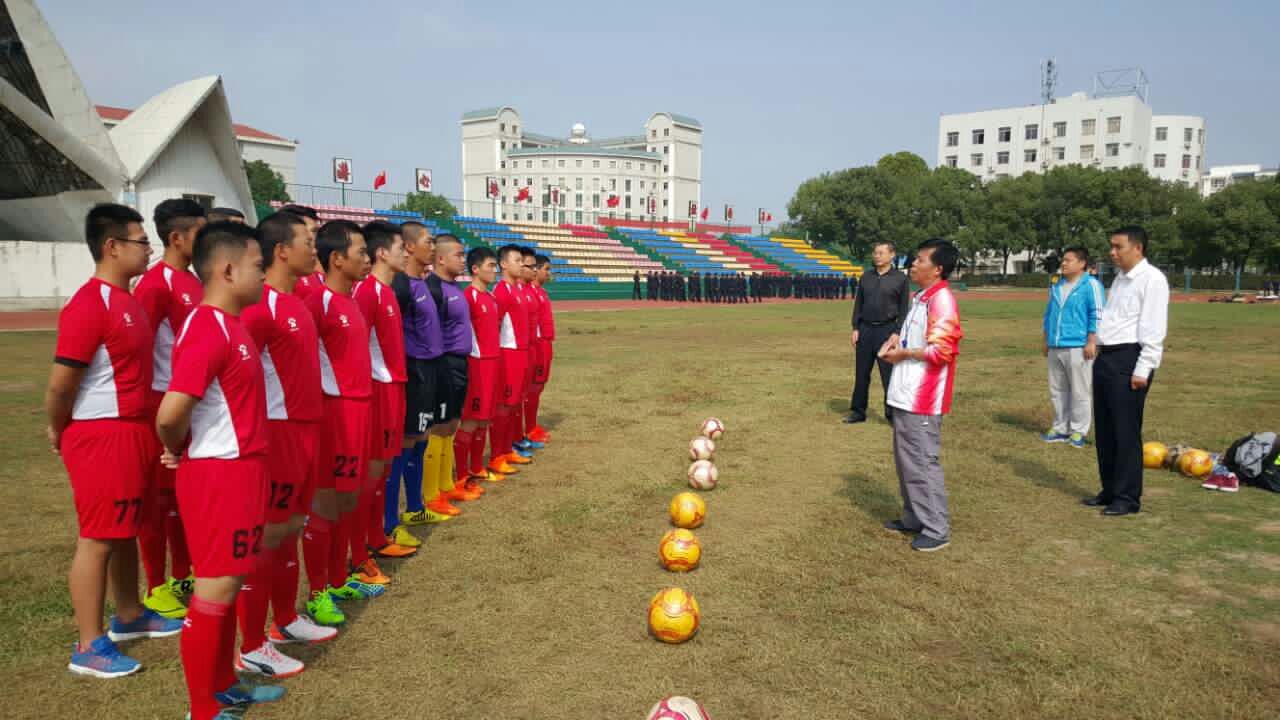 在领队警体部主任张怀胜、田常根和主教练董利老师的带领下正整装待发。学院刘重兴书记、潘东升副院长亲临训练场看望带队的老师和同学们。全心参加比赛锻炼意志。打出水平。发挥好技术水平。在领队和指导老师的带领下